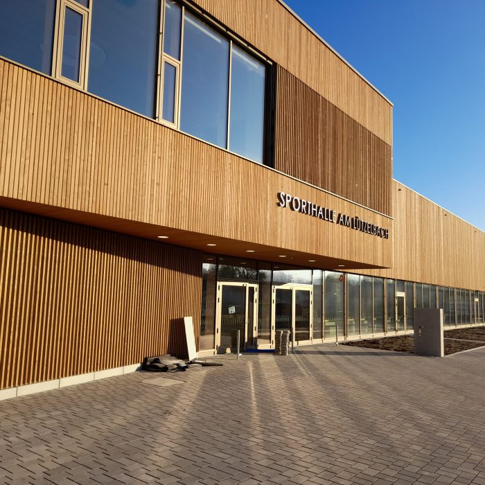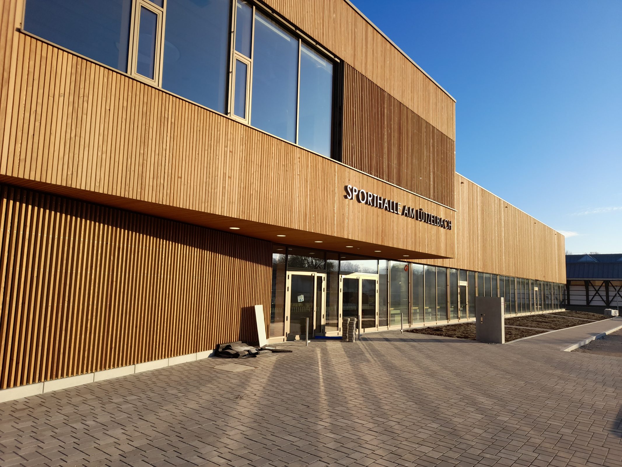 Die neue 3-teilbare Sporthalle wurde in direkter Anbindung an die bestehende Sporthalle geplant. Die Hanglage erlaubte die Unterbringung aller Nebenräume in einem zweigeschossigen Trakt auf der Hangseite, wodurch die talseitige Längsseite der Halle komplett verglast und die Aussicht in Richtung Sportanlagen und Bach freigehalten werden konnte. Die Zuschauertribüne mit 199 Plätzen sowie die Umkleideräume wurden auf der oberen Ebene angesiedelt, die Geräteräume, Technik, Behindertenumkleide und WC unten auf der Hallenebene. Die Erschließung der drei Hallenteile erfolgt getrennt möglich über zwei Treppenanlagen. Ein separater Sportler/Schülereingang erlaubt die Erschließung der Sporthalle unabhängig vom Foyer (Mensa).Im ebenfalls zweigeschossigen Zwischenbau zur bestehenden Sporthalle befindet sich der Haupteingang, das Foyer (Mensa) mit Verteilerküche sowie unten, über eine Treppe verbunden, ein Schüleraufenthaltsraum, weitere Nebenräume sowie ein separater Zugang von außen. Die Hallenebene des Neubaus wurde auf das Niveau der bestehenden Sporthalle gesetzt, damit ist eine direkte und schwellenlose Verbindung möglich.