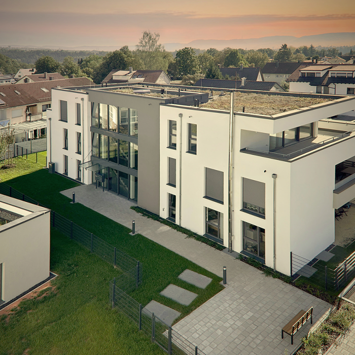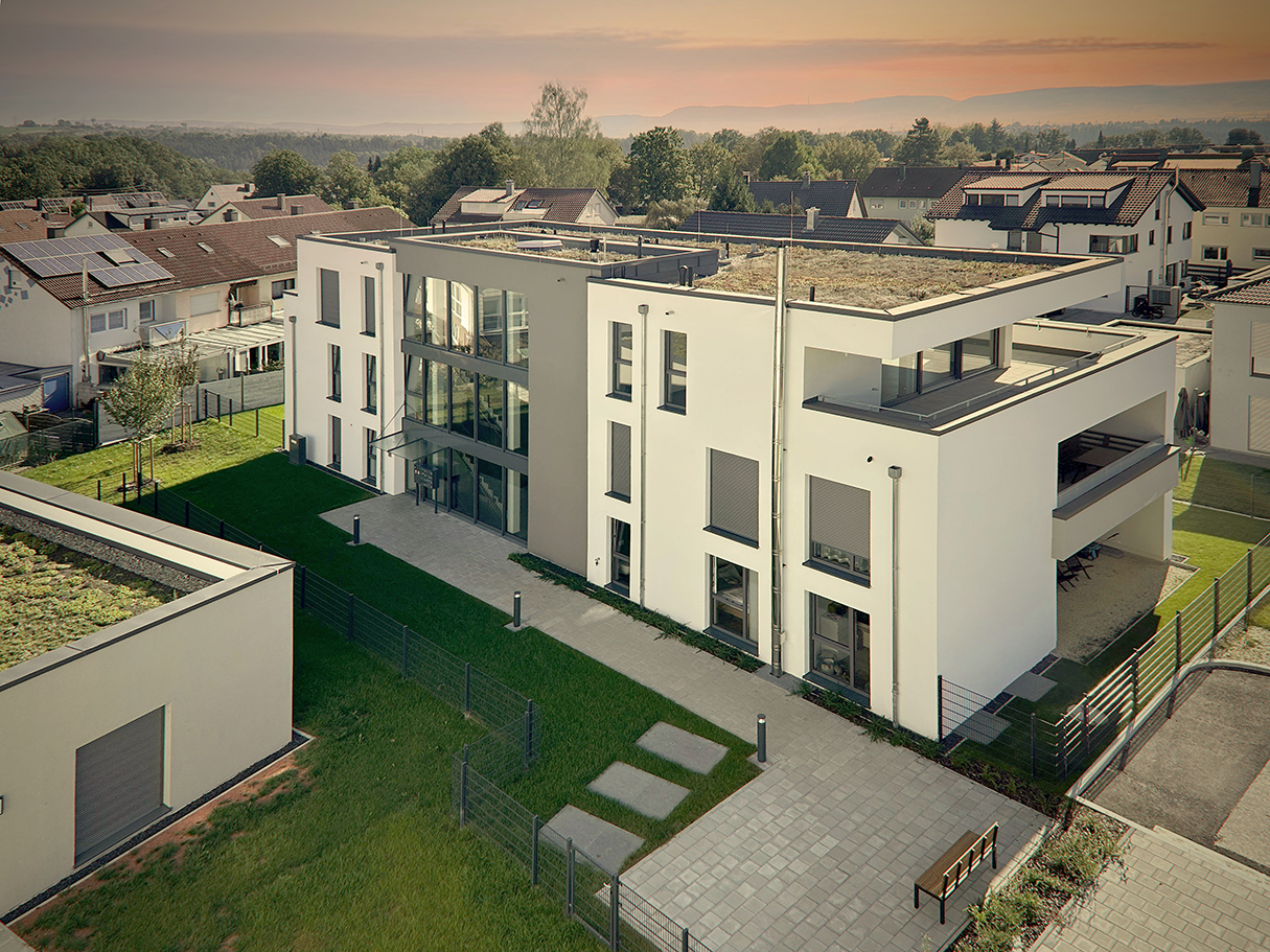 Die beiden Baukörper werden durch einen gemeinsamen, begrünten Hof- und Gartenbereich sowie die darunterliegende Tiefgarage miteinander verbunden. Auf rund 2.278 Quadratmetern Wohnfläche verteilen sich die Wohnungen und die Senioren-WG auf drei bzw. vier Stockwerke. Die modernen 2,5- und 3,5-Zimmer-Wohnungen verfügen über Wohnflächen zwischen circa 55 und 116 Quadratmetern. Die sorgsam und flexibel geplanten Grundrisse lassen Raum für eigene Ideen.